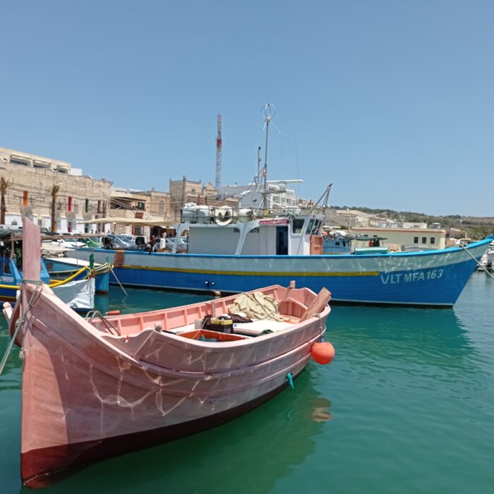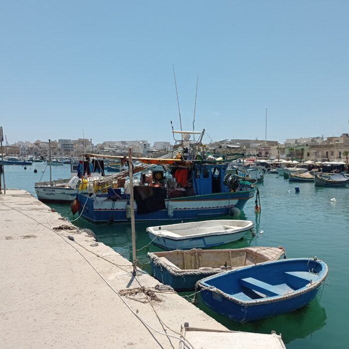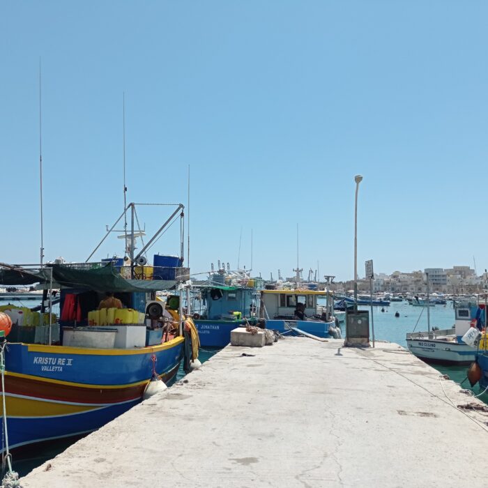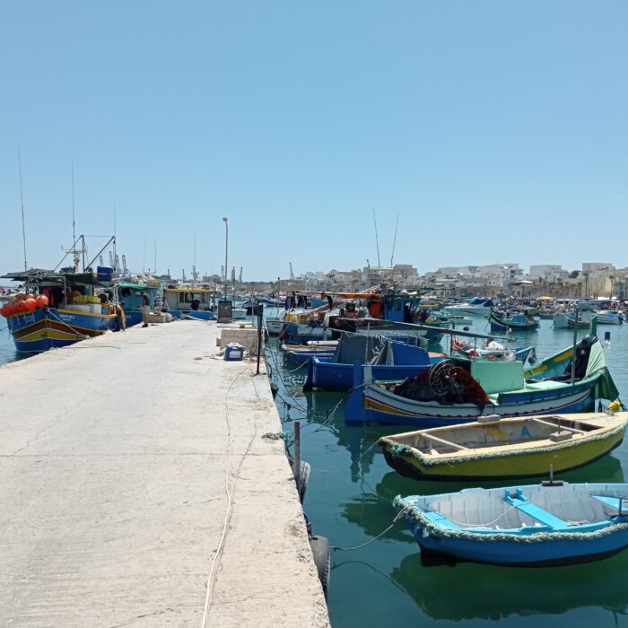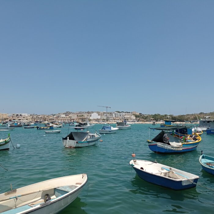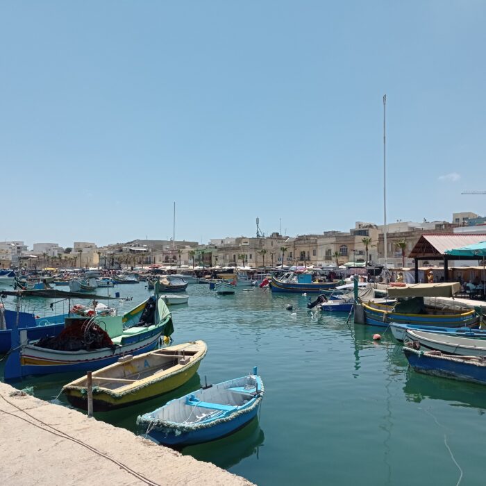 Następnego dnia rano pojechaliśmy do Marsaxlokk, który znajduje się na południu Malty. Co niedzielę odbywa się tutaj słynny targ, który jest czynny od rana do godziny 12.00. Ze względu na to, że odwiedza to miejsce bardzo dużo osób, miejscowych jak i turystów autobusy są przepełnione. Dojazd w ten dzień może nie być łatwy, bo zdarza się, że pełny autobus ludzi nie zatrzyma się na przystanku i trzeba czekać na kolejne. Najlepiej zjawić się tu o świcie, kiedy nie ma jeszcze tyle ludzi. Marsaxlokk to wioska rybacka słynąca z kolorowych łodzi rybackich nazywanych Luzzu. Pomalowane na charakterystyczne dla nich kolory- żółty, niebieski, czerwony i zielony i z parą oczu “Horusa”, które mają chronić rybaków na morzu. Warto przejść się wzdłuż wybrzeża i je