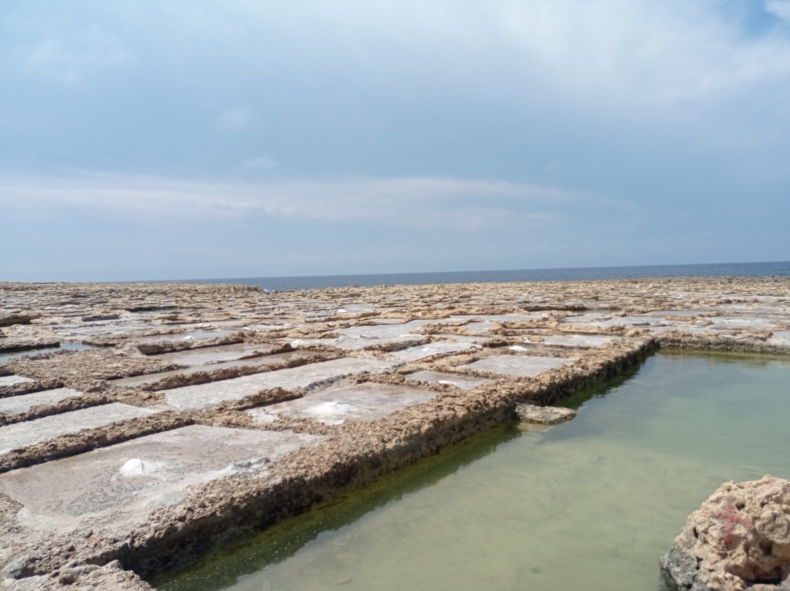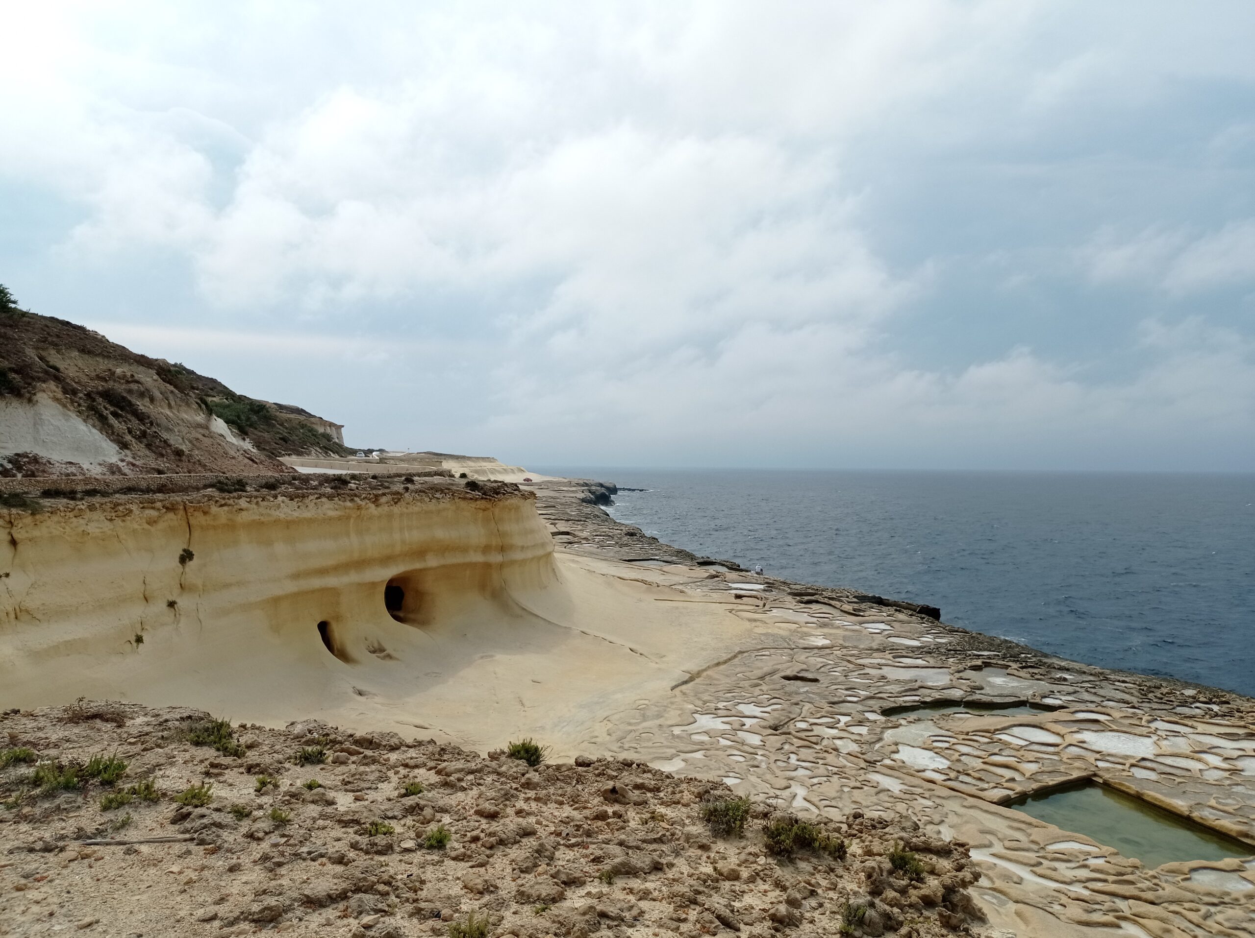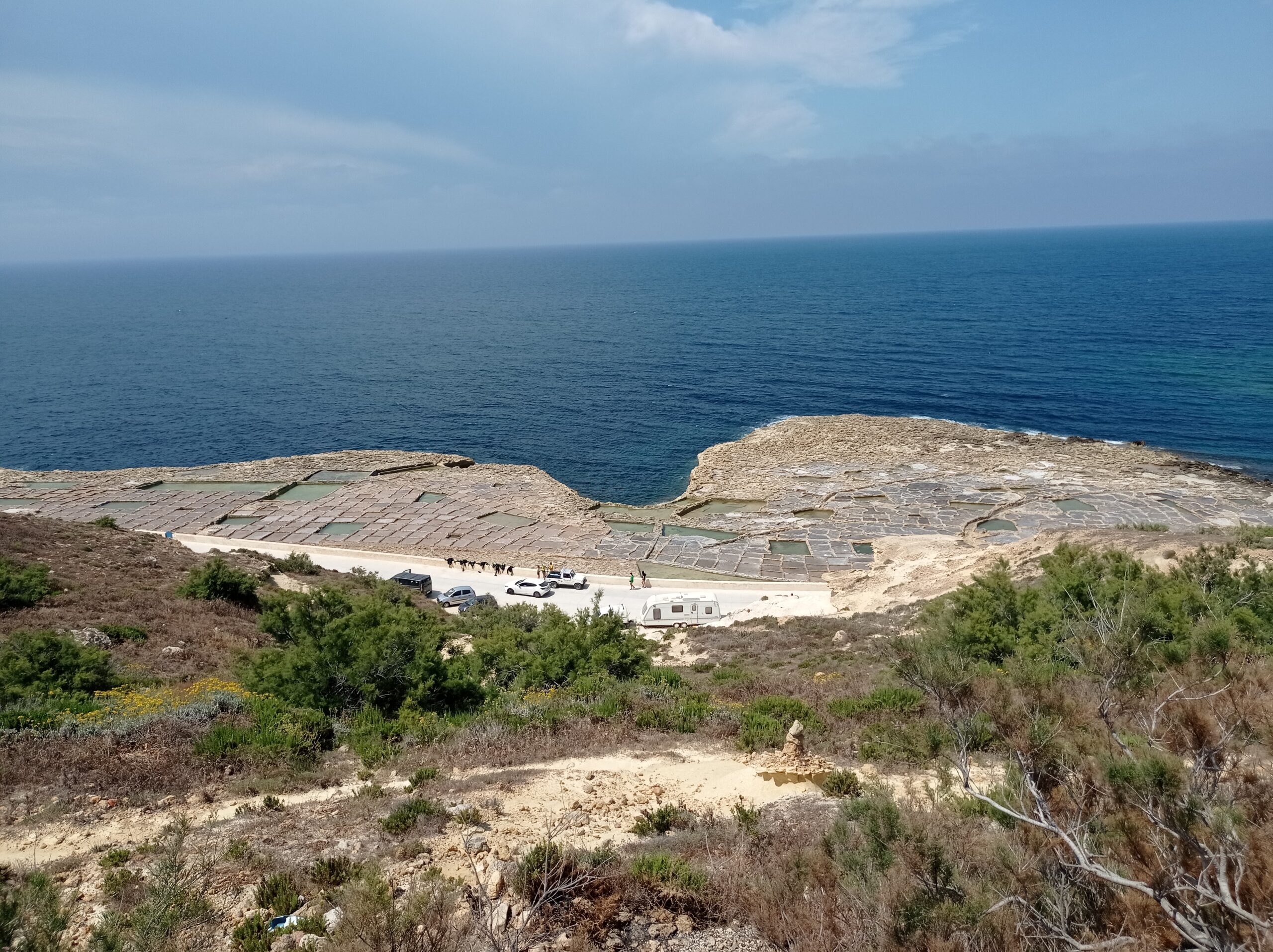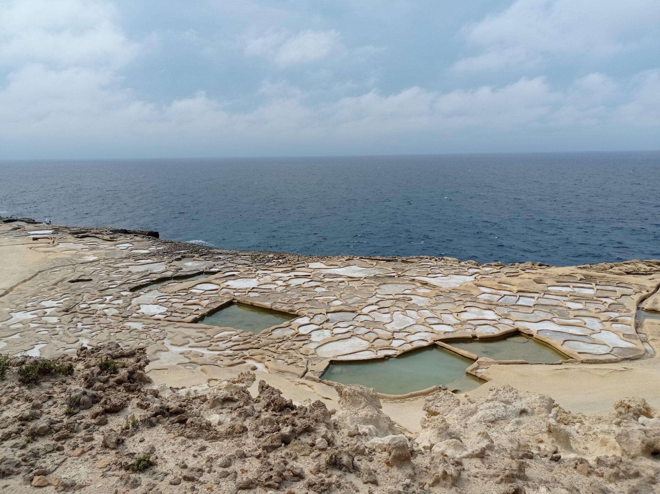 Stamtąd udaliśmy się na wybrzeże Gozo do Xwejni Bay gdzie znajduje się m.in. piękna zatoka z charakterystycznym stożkiem wapiennym. Warto zajrzeć też do pobliskiej płytkiej wapiennej jaskini powstałej w wyniku erozji a także przespacerować się po wzniesieniu skąd są piękne widoki na okolicę. Aby zwiedzić to miejsce to przyjechaliśmy autobusem do miejscowości Żebbuġ i z ostatniego przystanku pieszo zeszliśmy ok 1km nad same wybrzeże. Tuż obok jaskini możecie podziwiać panwie solne czyli baseny solankowe, które od wieków były miejscem uzyskiwania soli poprzez odparowanie wody morskiej. Miejsc takich jak to jest więcej na Gozo i najwięcej znajduje się w północnej części wyspy. Następnie wybrzeżem wzdłuż panwi solnych dotarliśmy do Doliny il-Għasri, której wody łączą się z morzem. Jest to wąwóz morski, znany jest szczególnie nurkom. Aby można się tam pokąpać trzeba zejść kamiennymi schodkami w dół na małą kamienistą plażę. Nie jest to często odwiedzane przez ludzi miejsce i dlatego możemy polecić je na odpoczynek. Trasa wzdłuż wybrzeża to ok 8 km. Stamtąd podeszliśmy na przystanek skąd autobusem, promem i znowu autobusem dojechaliśmy do noclegu w Mside, po drodze oczywiście wpadając na kolację kosztując kolejnych miejscowych potraw.