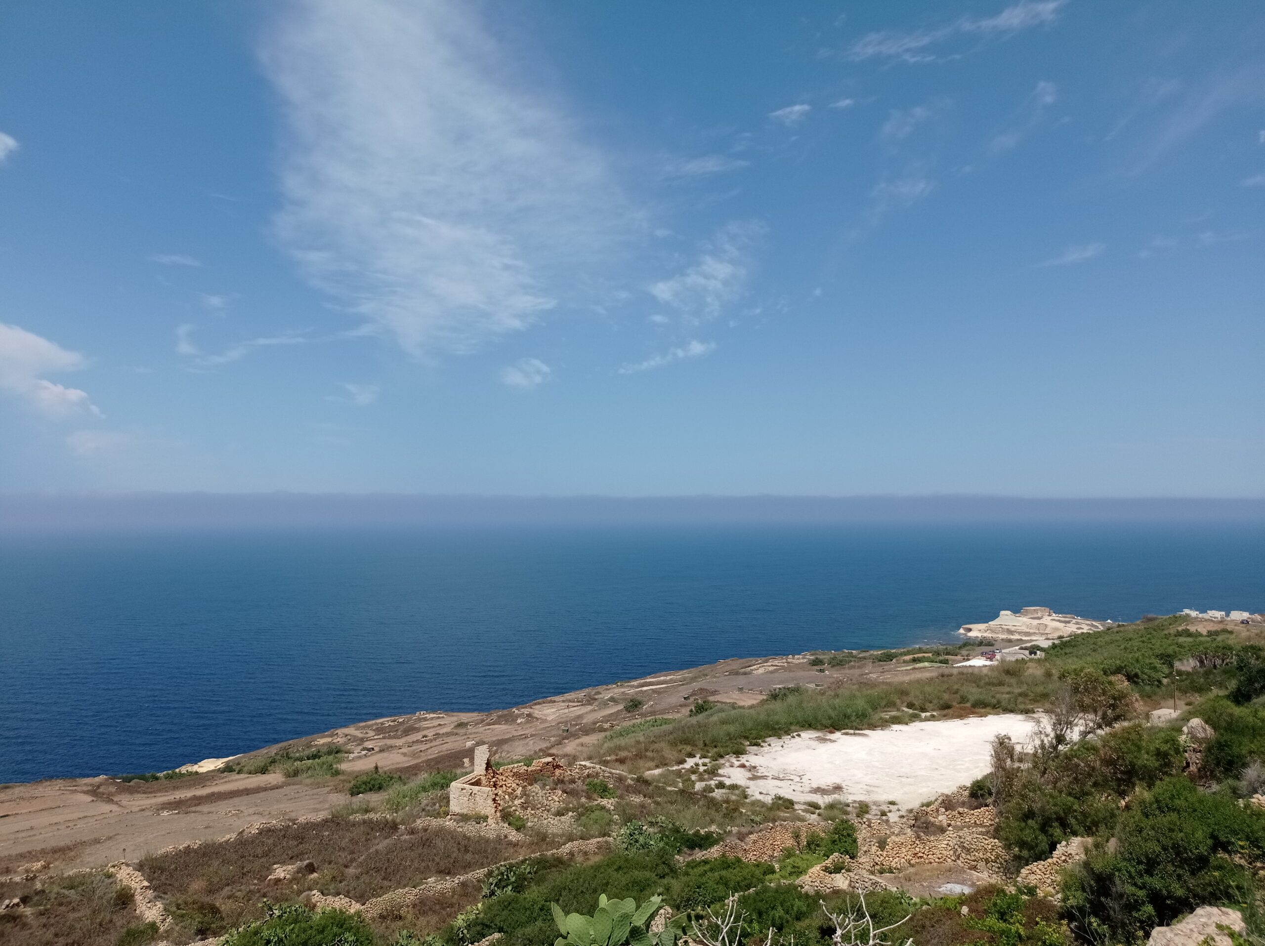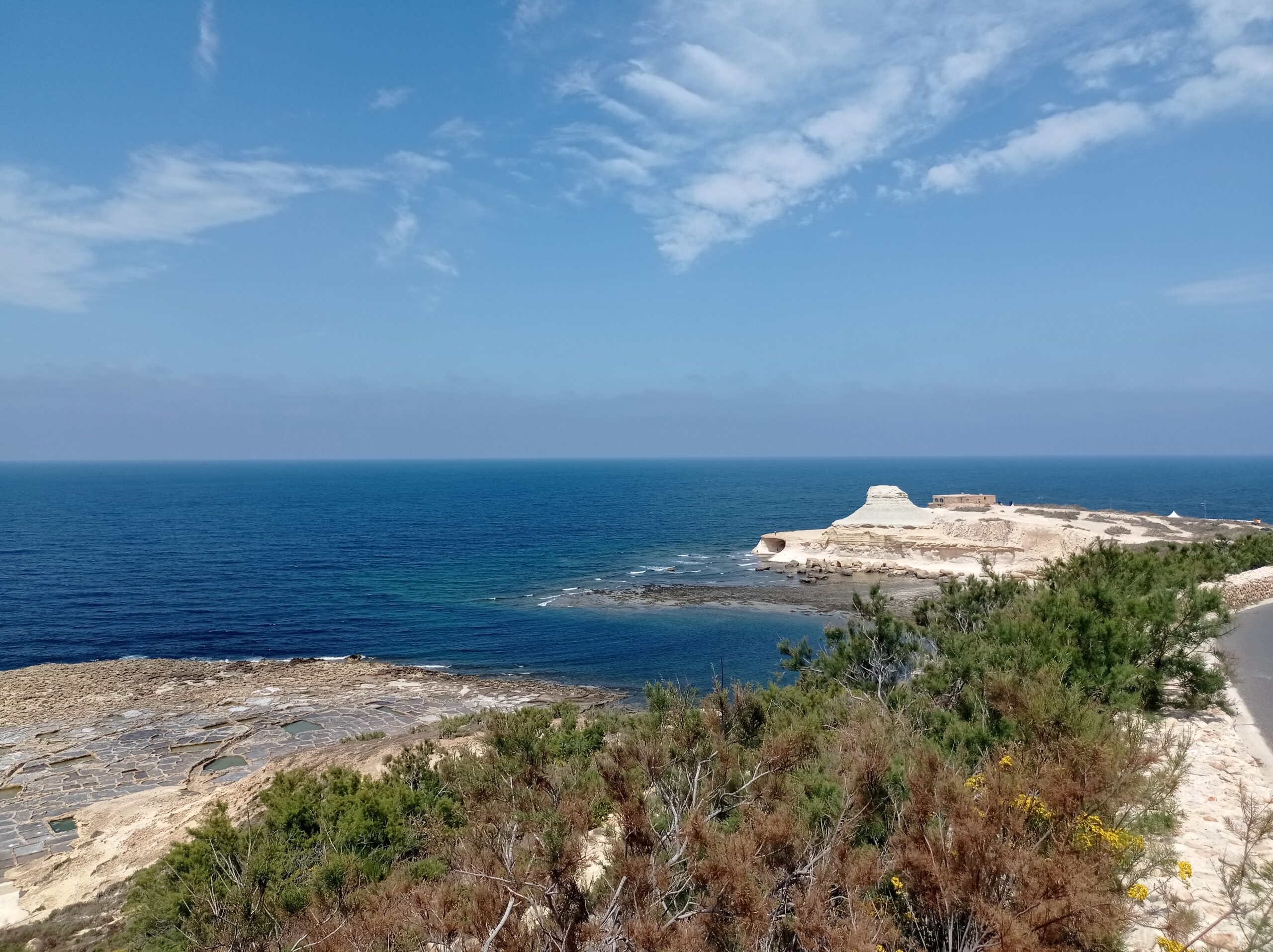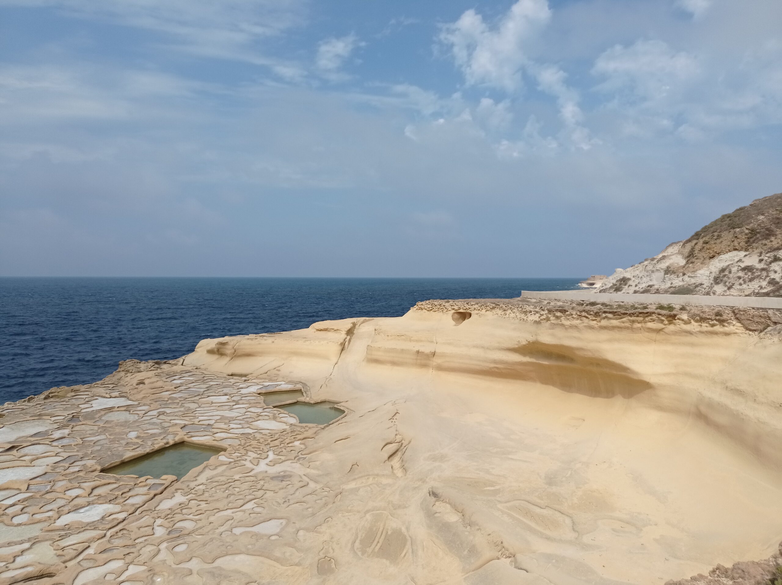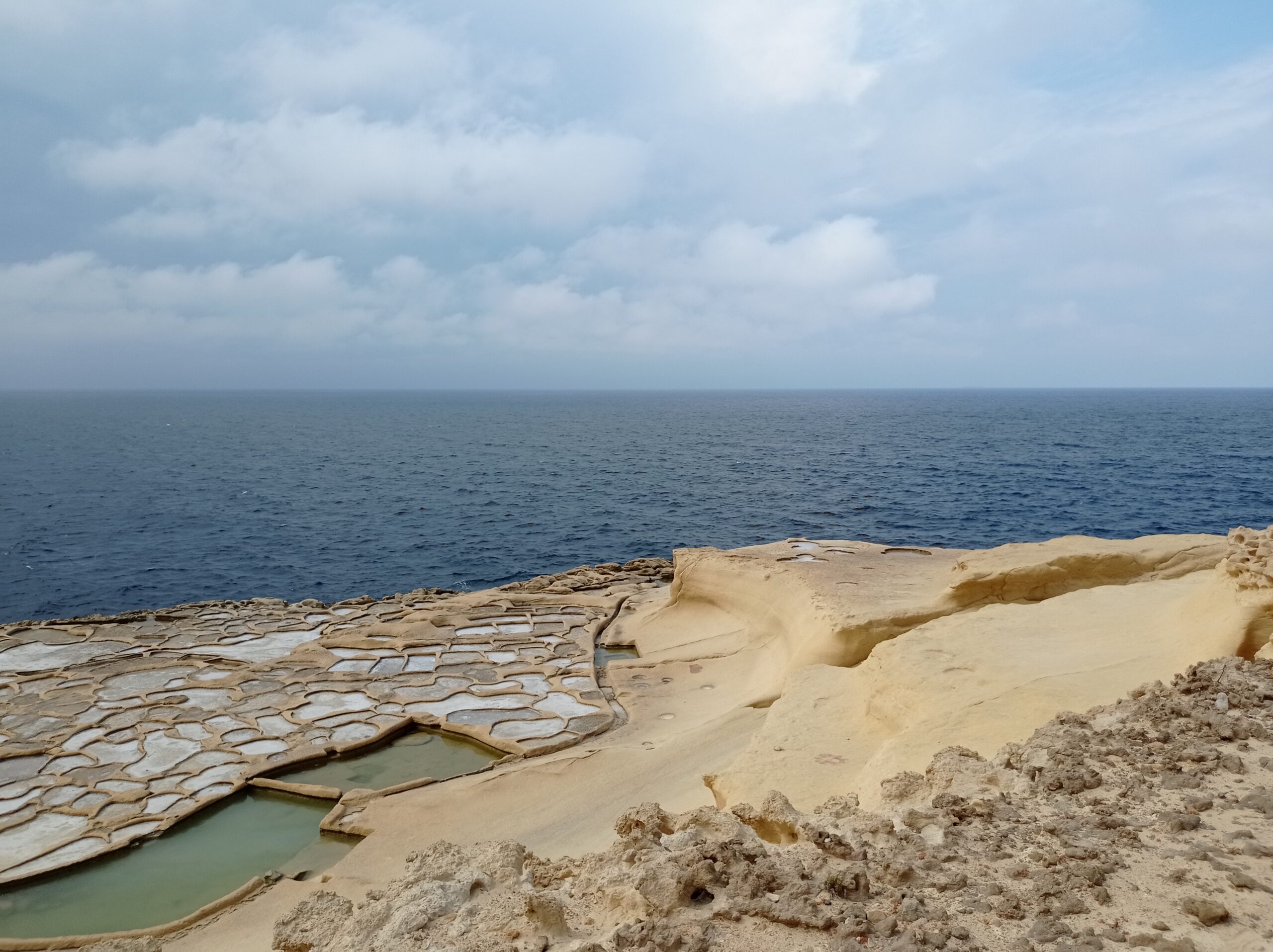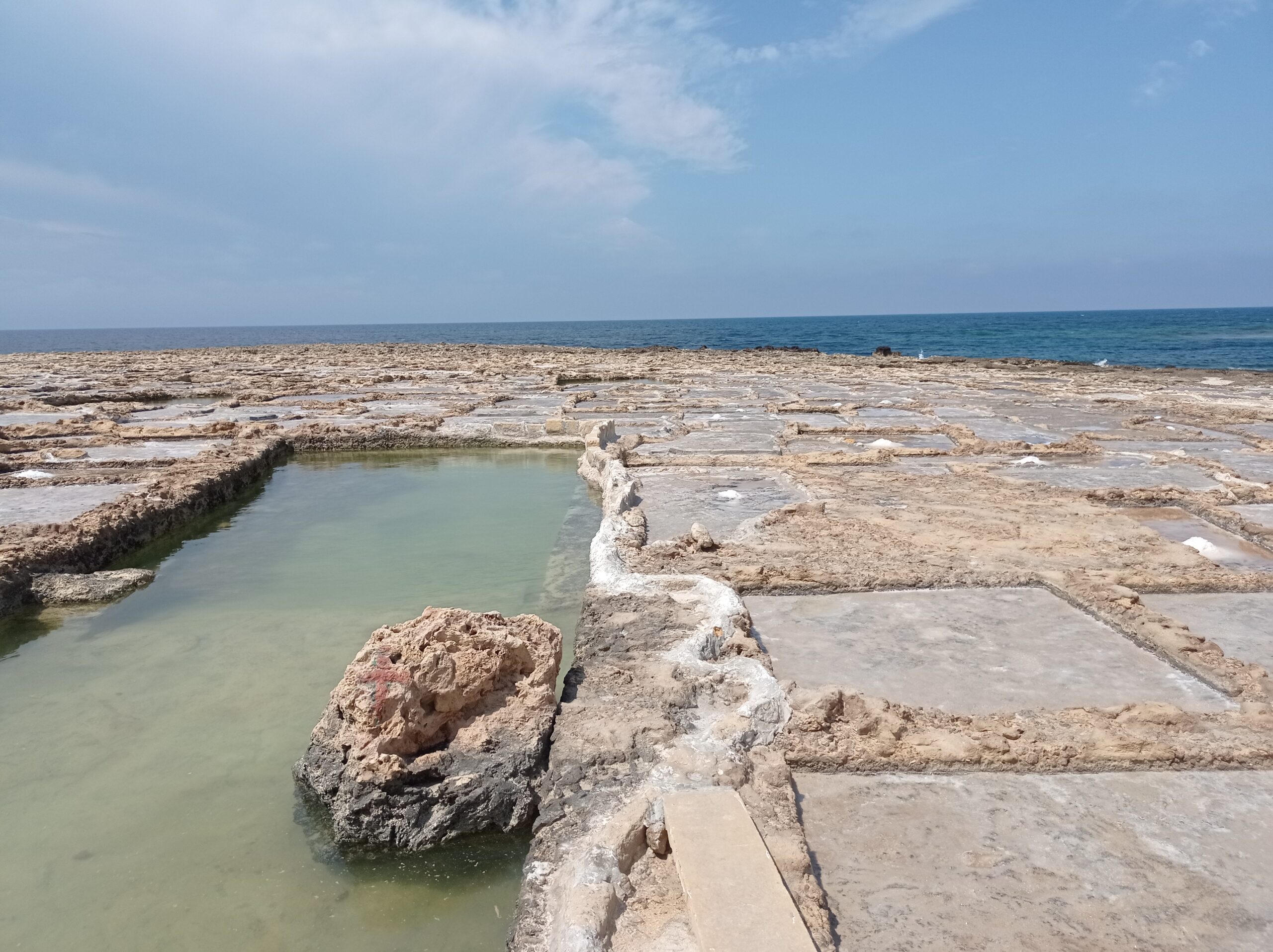 Stamtąd udaliśmy się na wybrzeże Gozo do Xwejni Bay gdzie znajduje się m.in. piękna zatoka z charakterystycznym stożkiem wapiennym. Warto zajrzeć też do pobliskiej płytkiej wapiennej jaskini powstałej w wyniku erozji a także przespacerować się po wzniesieniu skąd są piękne widoki na okolicę. Aby zwiedzić to miejsce to przyjechaliśmy autobusem do miejscowości Żebbuġ i z ostatniego przystanku pieszo zeszliśmy ok 1km nad same wybrzeże. Tuż obok jaskini możecie podziwiać panwie solne czyli baseny solankowe, które od wieków były miejscem uzyskiwania soli poprzez odparowanie wody morskiej. Miejsc takich jak to jest więcej na Gozo i najwięcej znajduje się w północnej części wyspy. Następnie wybrzeżem wzdłuż panwi solnych dotarliśmy do Doliny il-Għasri, której wody łączą się z morzem. Jest to wąwóz morski, znany jest szczególnie nurkom. Aby można się tam pokąpać trzeba zejść kamiennymi schodkami w dół na małą kamienistą plażę. Nie jest to często odwiedzane przez ludzi miejsce i dlatego możemy polecić je na odpoczynek. Trasa wzdłuż wybrzeża to ok 8 km. Stamtąd podeszliśmy na przystanek skąd autobusem, promem i znowu autobusem dojechaliśmy do noclegu w Mside, po drodze oczywiście wpadając na kolację kosztując kolejnych miejscowych potraw.