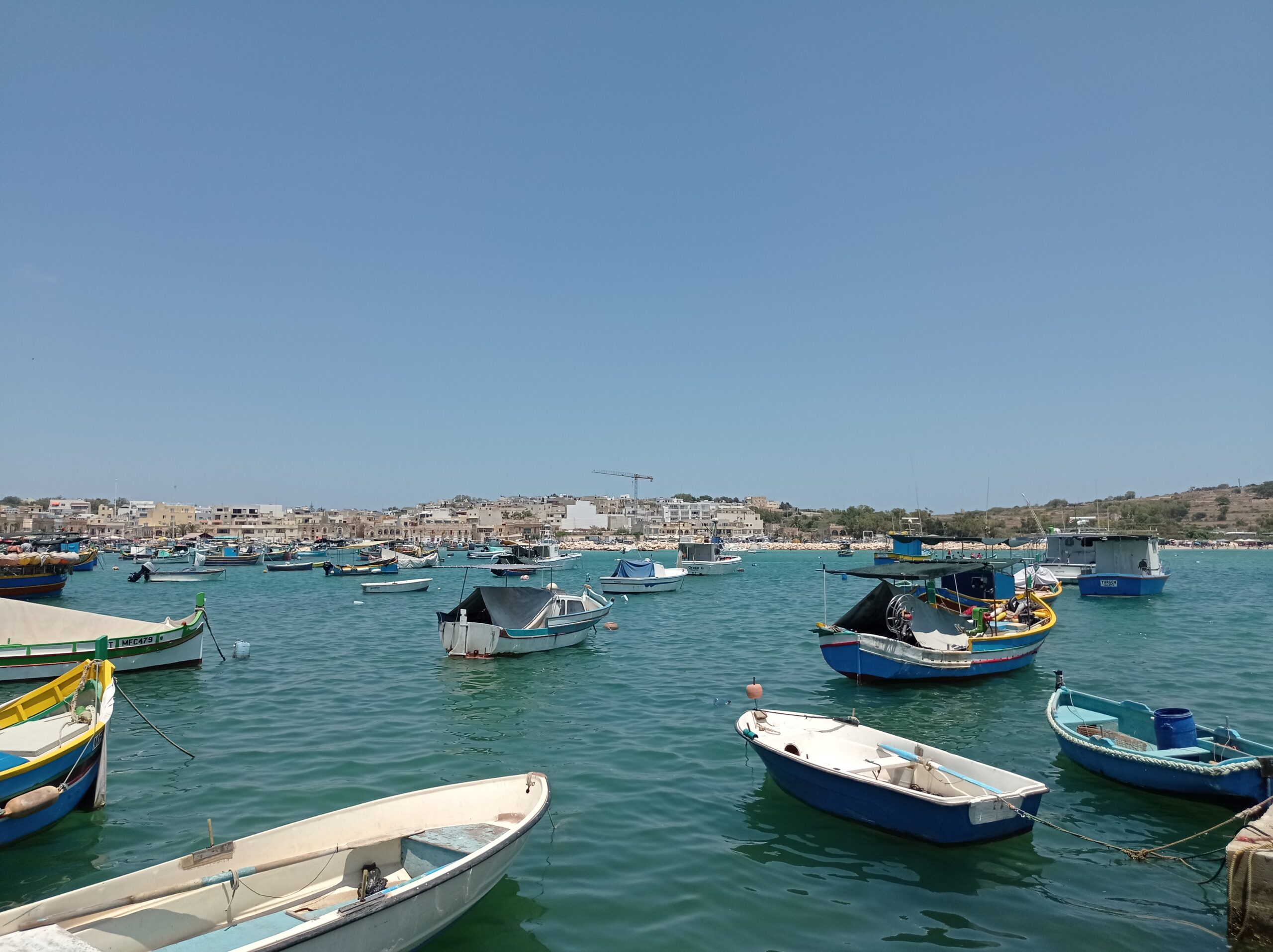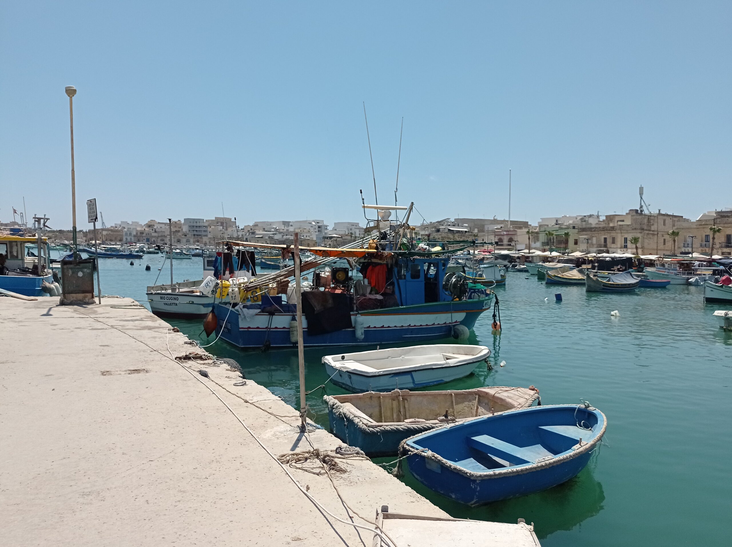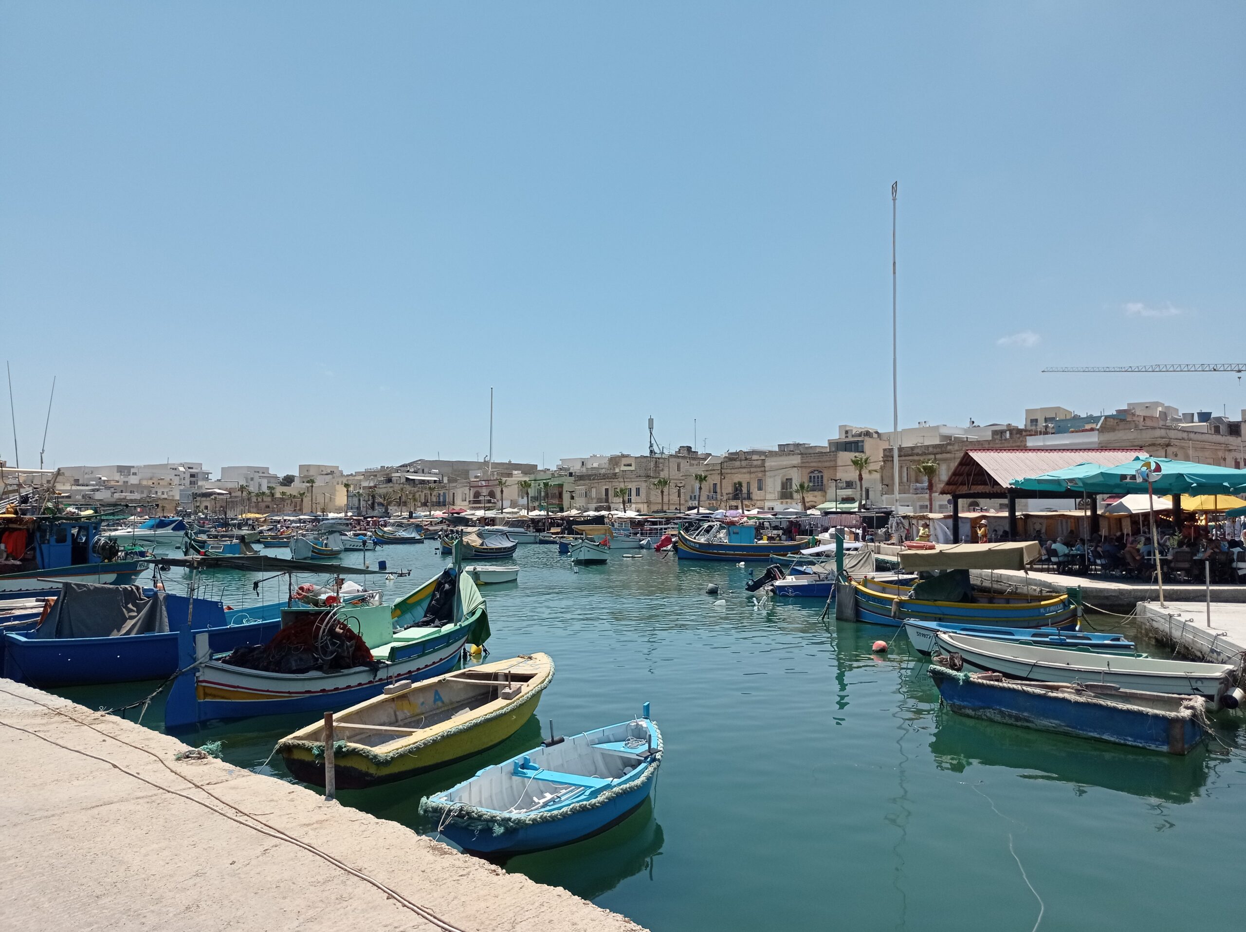 Następnego dnia rano pojechaliśmy do Marsaxlokk, który znajduje się na południu Malty. Co niedzielę odbywa się tutaj słynny targ, który jest czynny od rana do godziny 12.00. Ze względu na to, że odwiedza to miejsce bardzo dużo osób, miejscowych jak i turystów autobusy są przepełnione. Dojazd w ten dzień może nie być łatwy, bo zdarza się, że pełny autobus ludzi nie zatrzyma się na przystanku i trzeba czekać na kolejne. Najlepiej zjawić się tu o świcie, kiedy nie ma jeszcze tyle ludzi. Marsaxlokk to wioska rybacka słynąca z kolorowych łodzi rybackich nazywanych Luzzu. Pomalowane na charakterystyczne dla nich kolory- żółty, niebieski, czerwony i zielony i z parą oczu “Horusa”, które mają chronić rybaków na morzu. Warto przejść się wzdłuż wybrzeża i je