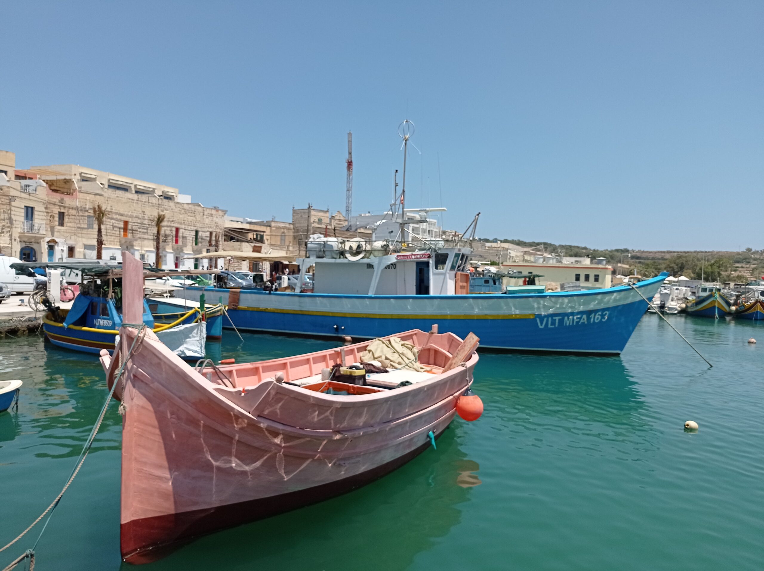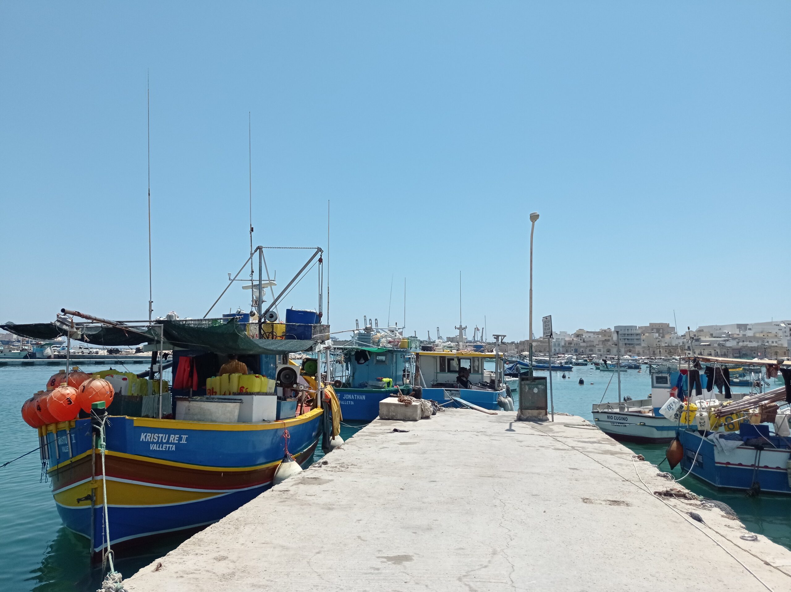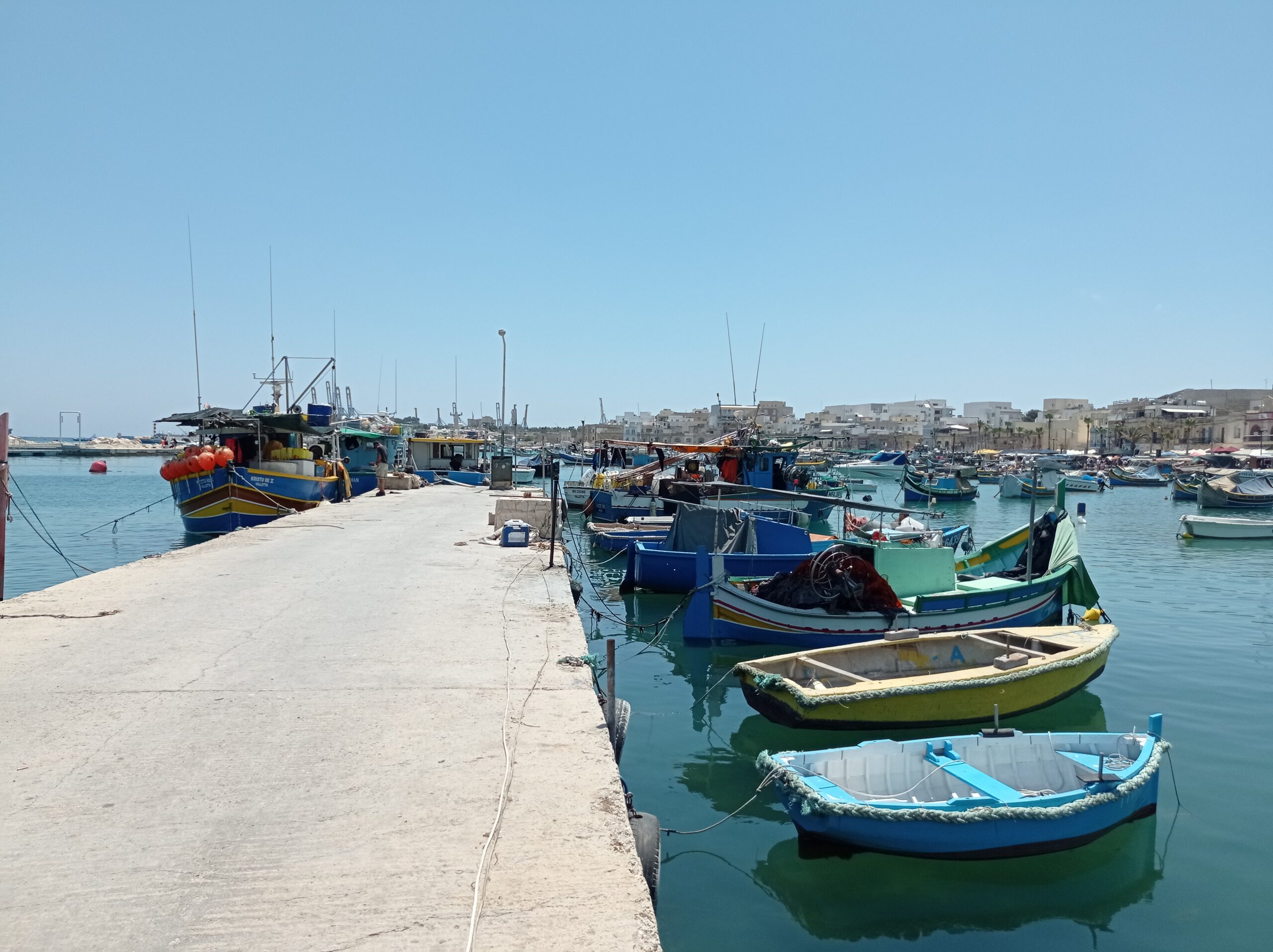 Następnego dnia rano pojechaliśmy do Marsaxlokk, który znajduje się na południu Malty. Co niedzielę odbywa się tutaj słynny targ, który jest czynny od rana do godziny 12.00. Ze względu na to, że odwiedza to miejsce bardzo dużo osób, miejscowych jak i turystów autobusy są przepełnione. Dojazd w ten dzień może nie być łatwy, bo zdarza się, że pełny autobus ludzi nie zatrzyma się na przystanku i trzeba czekać na kolejne. Najlepiej zjawić się tu o świcie, kiedy nie ma jeszcze tyle ludzi. Marsaxlokk to wioska rybacka słynąca z kolorowych łodzi rybackich nazywanych Luzzu. Pomalowane na charakterystyczne dla nich kolory- żółty, niebieski, czerwony i zielony i z parą oczu “Horusa”, które mają chronić rybaków na morzu. Warto przejść się wzdłuż wybrzeża i je