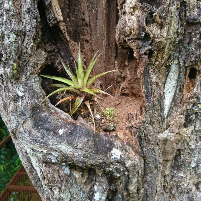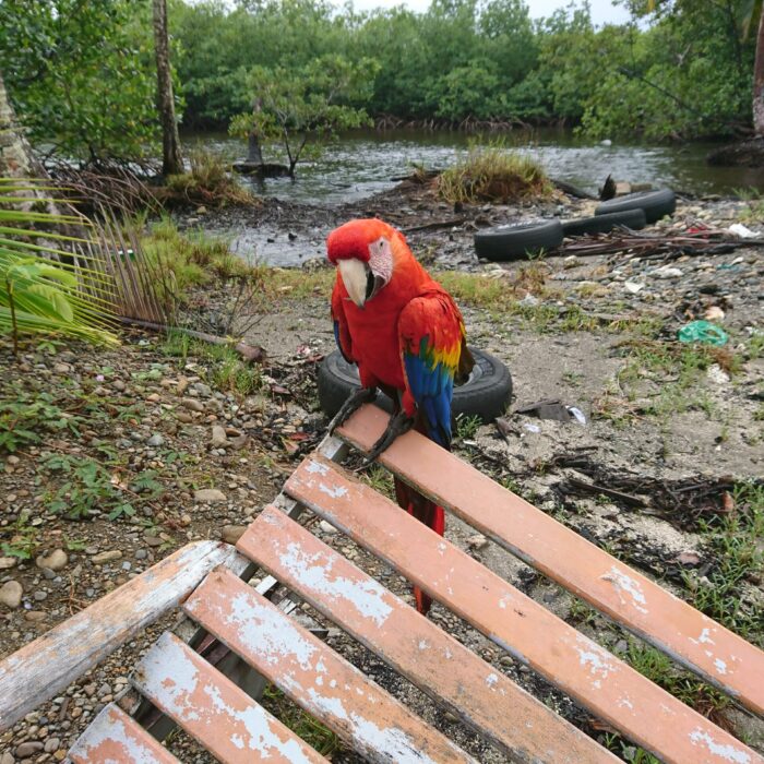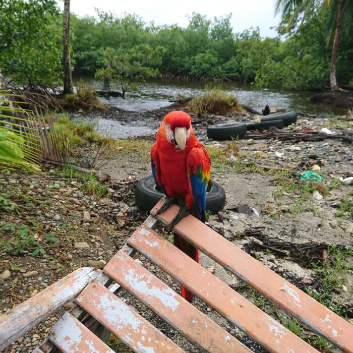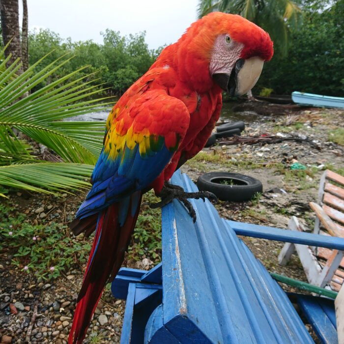 Później miały być leniwce, ale niestety pochowały się w koronach drzew. Taka jest jednak dzika przyroda — to nie ona dopasowuje się do nas, tylko my musimy zaakceptować jej rytm. Kolejnym punktem był posiłek — przy barze udało się przy okazji sfotografować piękną arę, trzymaną tam przez właścicieli. W tym czasie zaczęło już mocno padać.