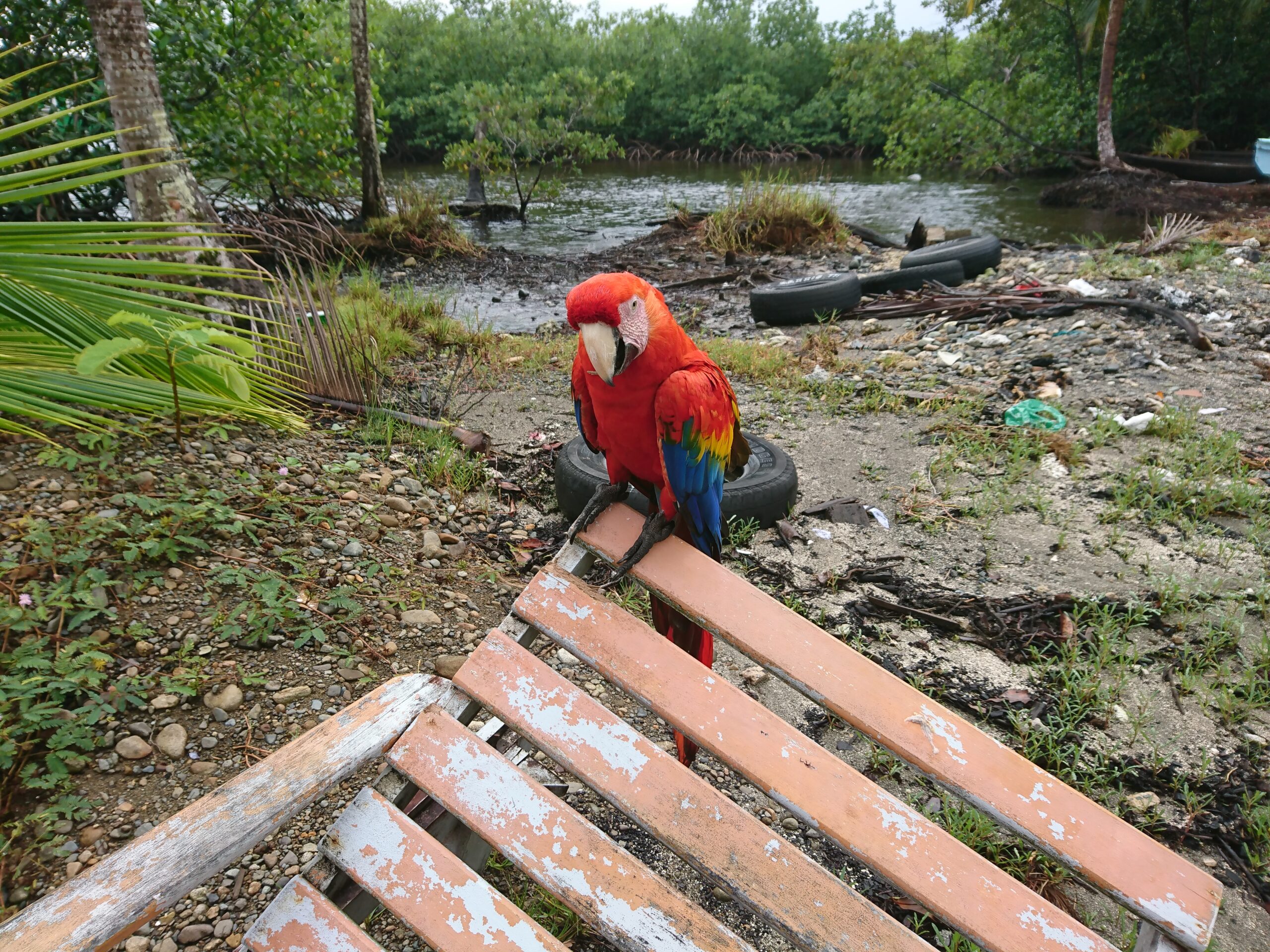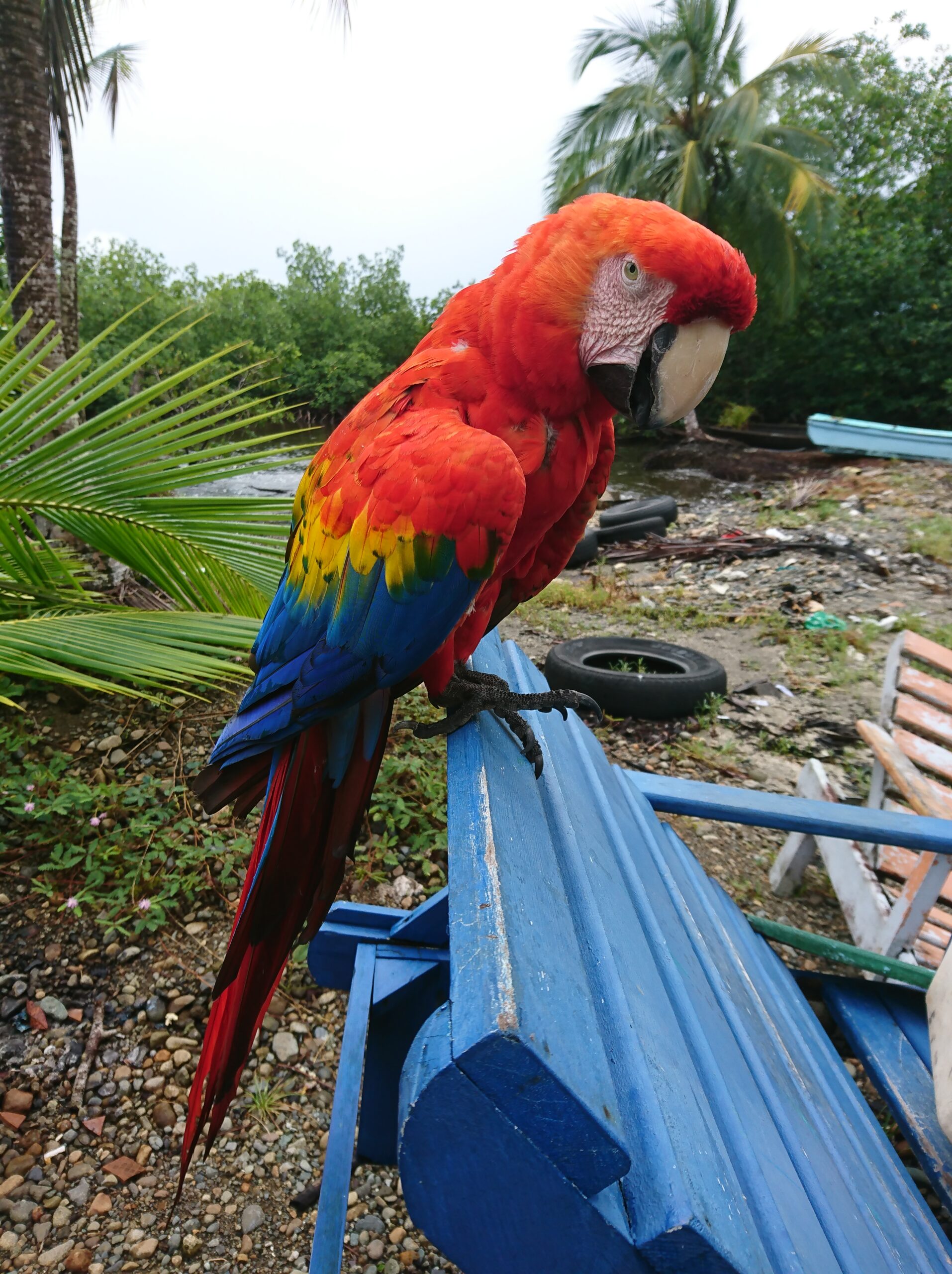 Później miały być leniwce, ale niestety pochowały się w koronach drzew. Taka jest jednak dzika przyroda — to nie ona dopasowuje się do nas, tylko my musimy zaakceptować jej rytm. Kolejnym punktem był posiłek — przy barze udało się przy okazji sfotografować piękną arę, trzymaną tam przez właścicieli. W tym czasie zaczęło już mocno padać.