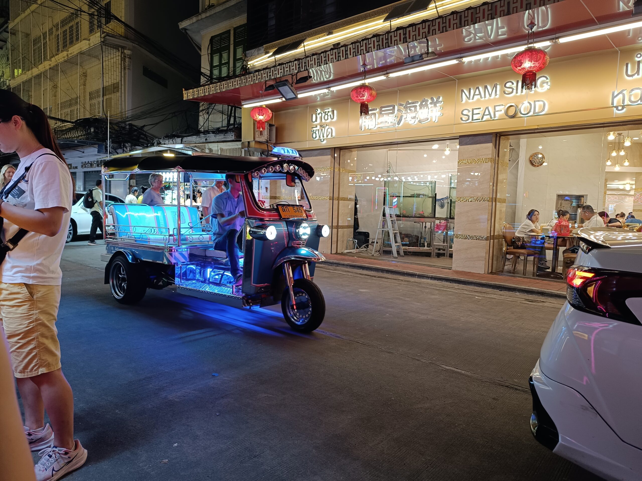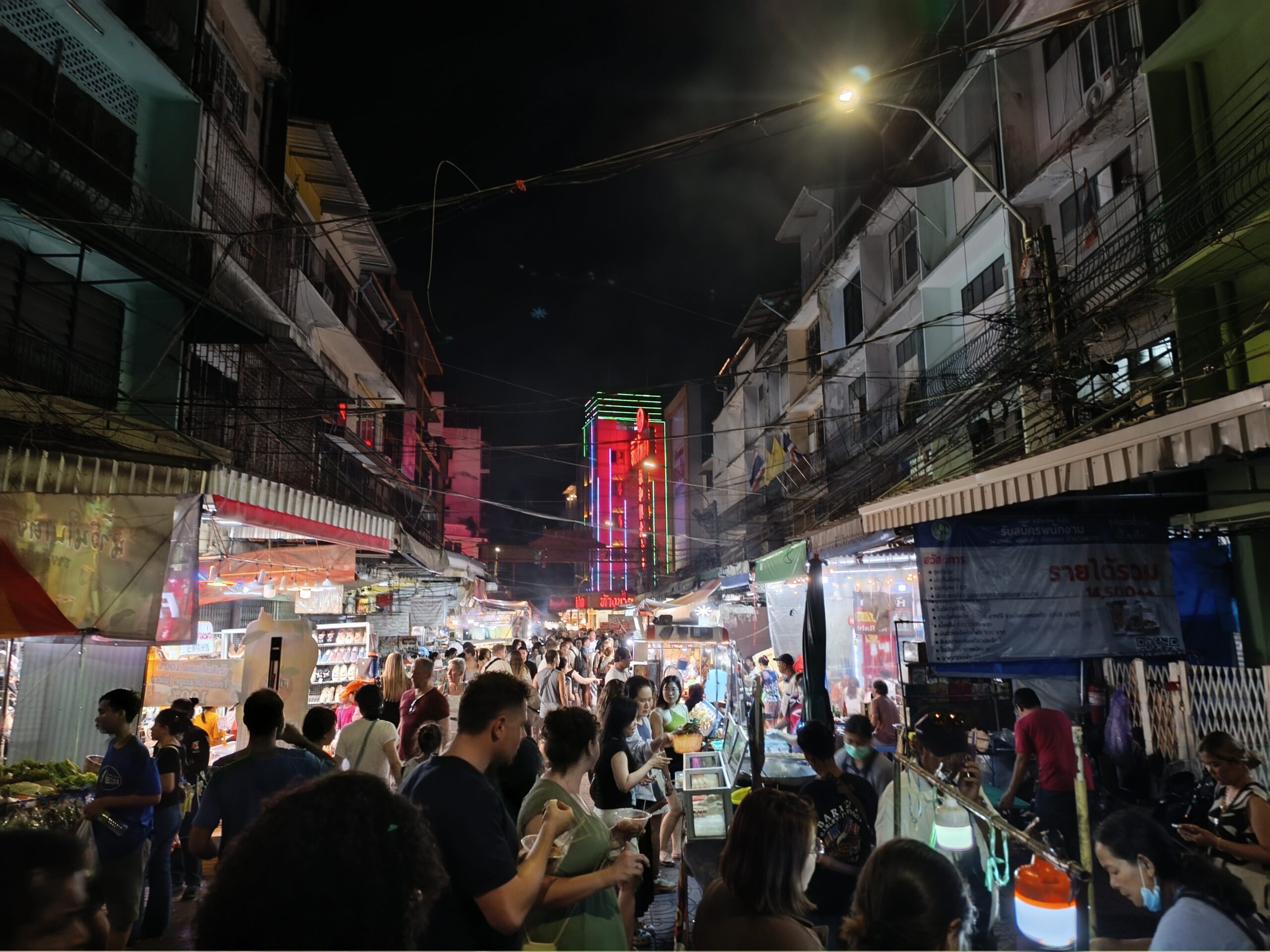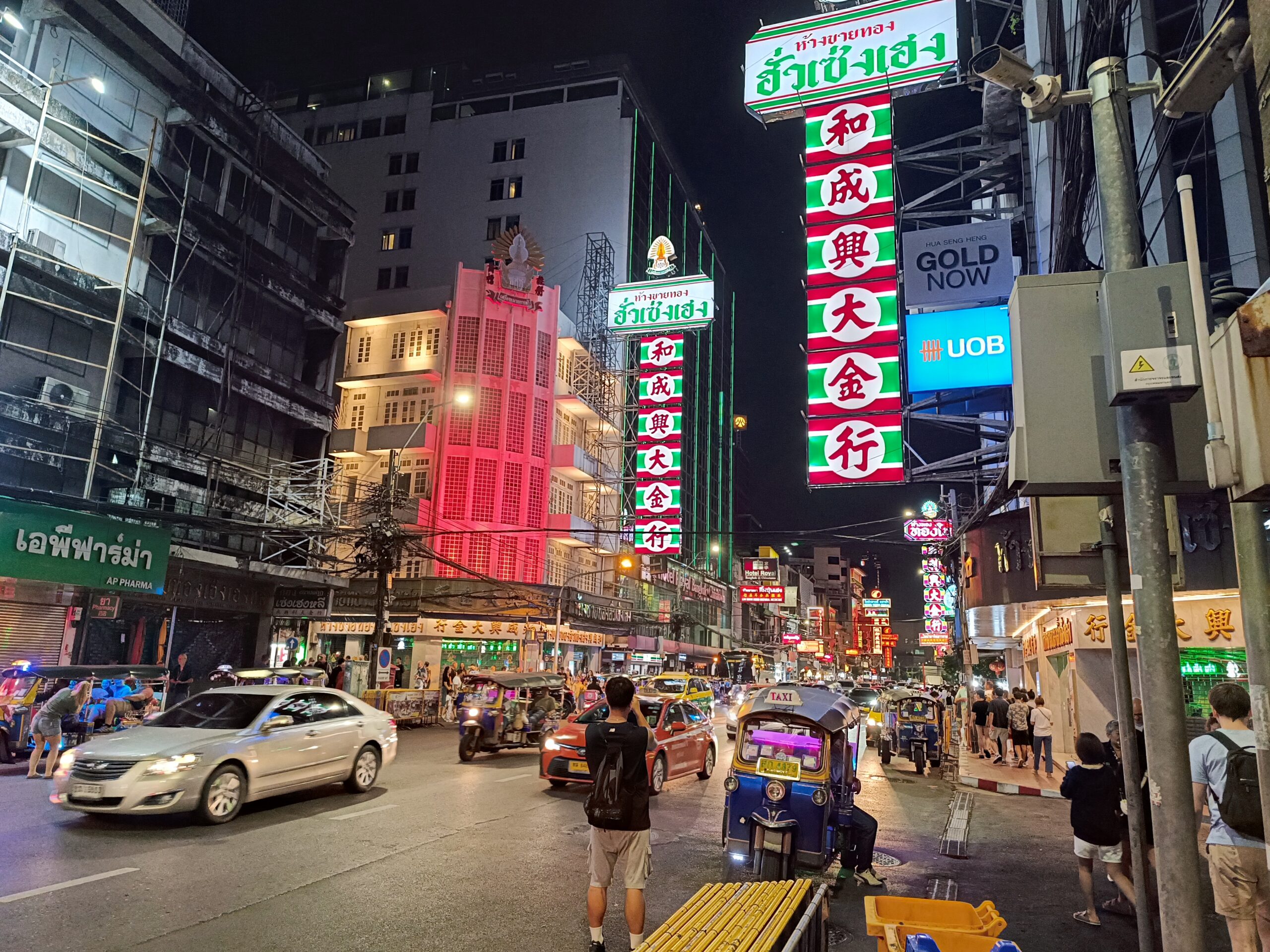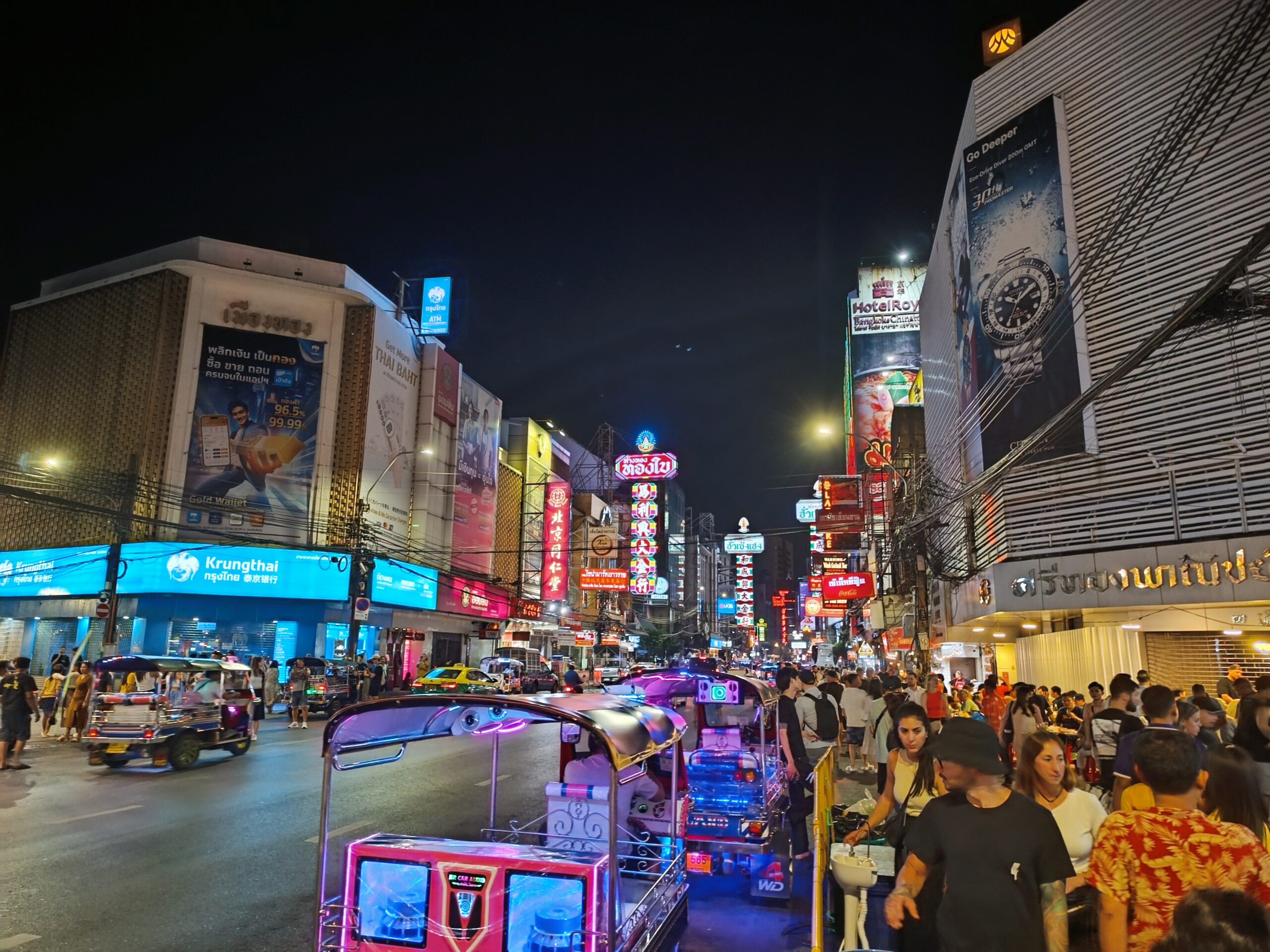 Ulice rozświetlają się tysiącami neonów – jaskrawe czerwienie, złota i zielenie malują mury kamienic, a chińskie znaki zdają się tańczyć w powietrzu. Główna arteria – ulica Yaowarat Road – zamienia się w jeden wielki deptak, pełen gwaru, zapachów i ludzi z każdej części świata. Na każdym kroku słychać syczenie woka, pokrzykiwania sprzedawców i śmiech klientów próbujących egzotycznych smakołyków.