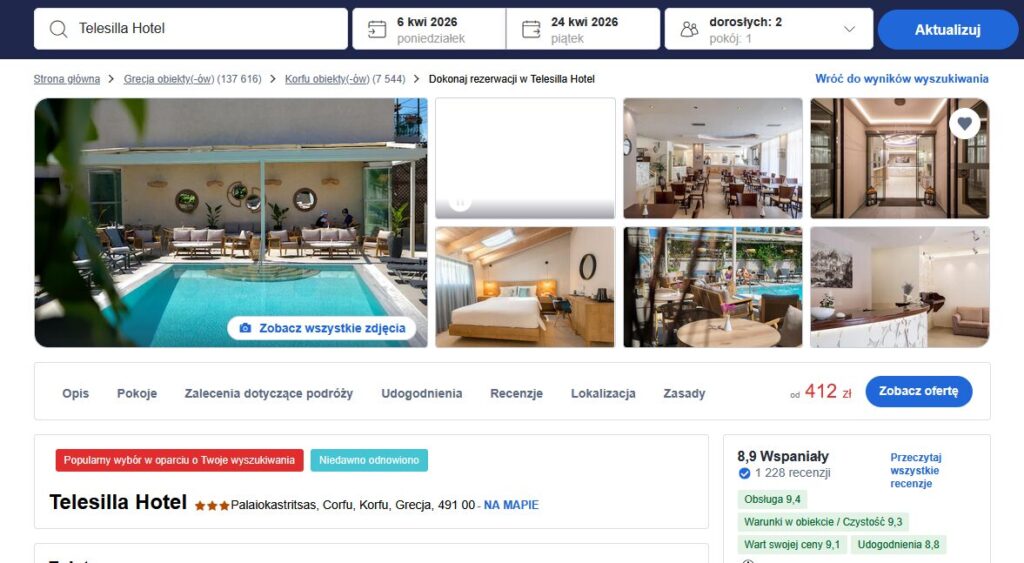 🏨 Telesilla Hotel to kameralny hotel położony w miejscowości Kontokali na wyspie Korfu, niedaleko mariny Gouvia i kilka minut od plaży. To dobre miejsce dla osób, które chcą odpocząć w spokojnej okolicy, a jednocześnie mieć łatwy dojazd do atrakcji wyspy.