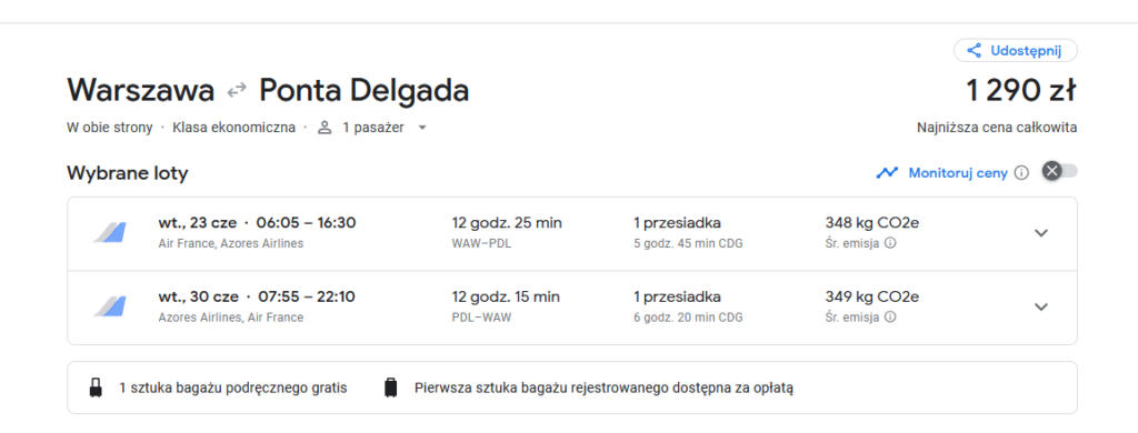 ➡️ Warszawa → Azory –  (przesiadka w Paryżu ok. 5h 45 min)