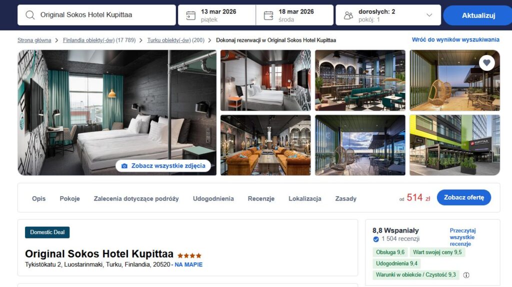 Original Sokos Hotel Kupittaa to nowoczesny hotel położony w dzielnicy Kupittaa w Turku, tuż obok stacji kolejowej i niedaleko uniwersytetu, dzięki czemu zapewnia bardzo dobry dojazd do centrum miasta 🚆